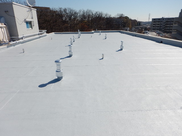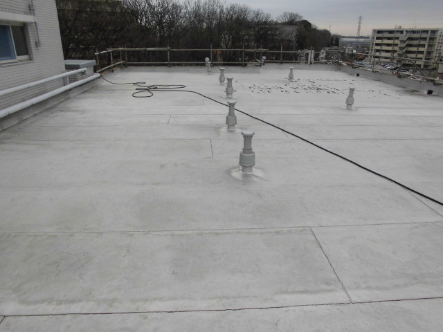 | 施工内容 | 埼玉県浦和市でアスファルト防水(トーチ工法)による防水改修工事を行いました。 施工面積は約400㎡。既存の防水層にはひび割れやめくれが多数見られ、漏水のリスクが高まっている状態でした。 採用したトーチ工法は、アスファルトシートの裏面をバーナーで加熱して密着させる工法です。 職人の手で一枚一枚を丁寧に重ね合わせていくことで、継ぎ目のない堅牢な防水層を形成できます。 耐久性にも優れ、10年以上にわたり安心して使える防水性能が期待できます。 施工中は、排水口や立ち上がり部といった細かな部分も丁寧に処理し、屋上全体をしっかりと保護。 仕上がりは、バーナーの熱で一体化した防水層がムラなく滑らかに仕上がり、建物の屋上が見違えるように整いました。 工事完了後は、見た目の美しさはもちろんのこと、安心して過ごせる空間として再生されています。 このような確実な防水改修は、建物の寿命を延ばし、資産価値を守るうえでも欠かせない重要な一歩です。 |