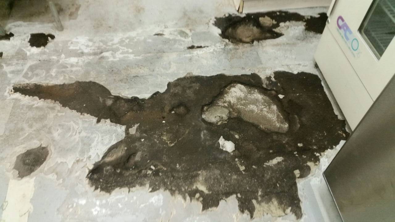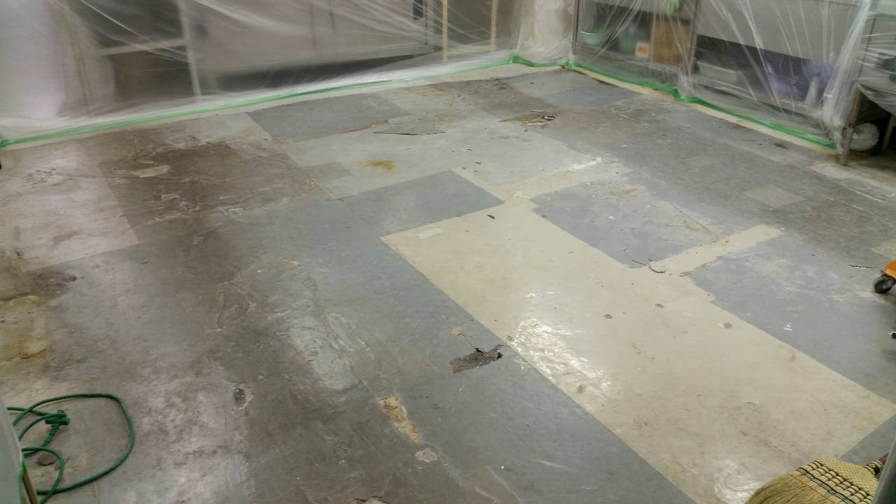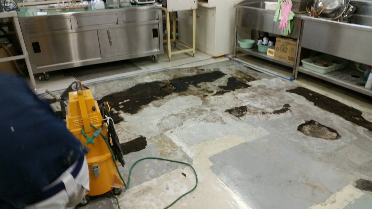 まずは、膨れや浮きが発生している既存塗膜を丁寧に撤去し、床面をフラットに戻す下地処理を実施。