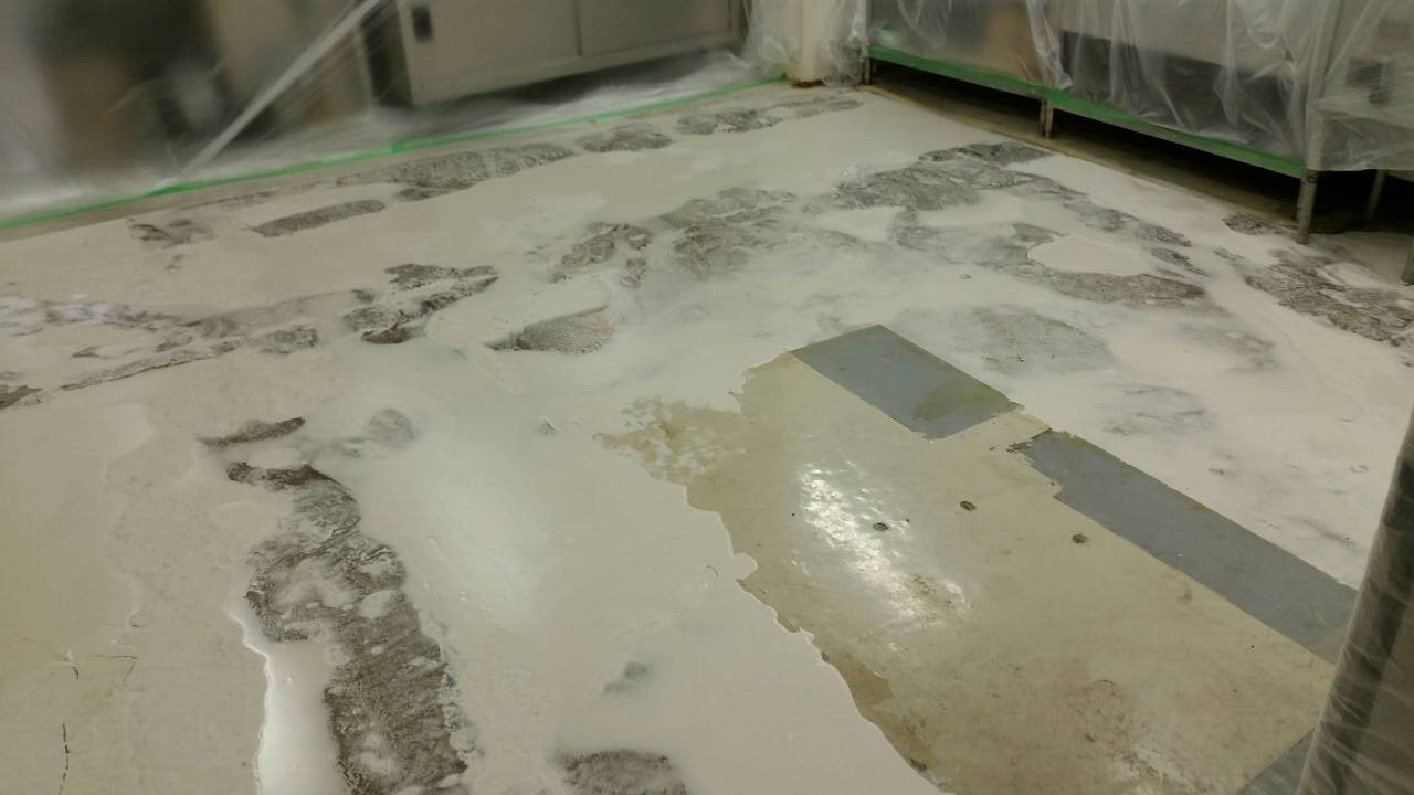 古い塗床材の一部は剥がれや浮きが激しく、衛生面や安全面への影響が懸念される状態でした。