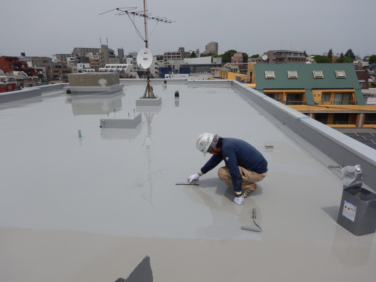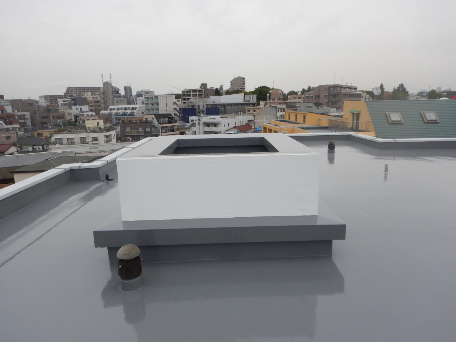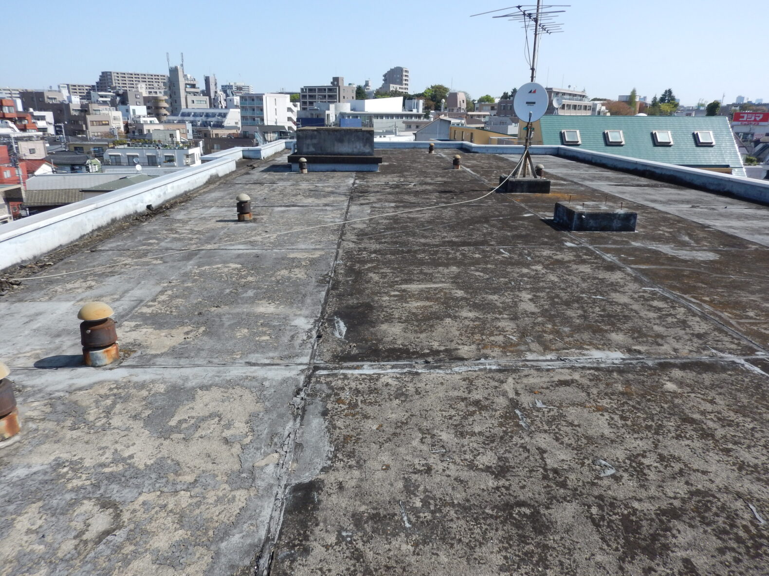 | 施工内容 | 東京都世田谷区用賀にて、約1,400㎡の屋上を対象としたシート防水工事を実施しました。 施工前は、紫外線や風雨の影響により防水層の劣化が進行し、広範囲にわたって浮きやひび割れが見られる状態でした。 このため、部分補修ではなく、全面的な防水改修が必要と判断しました。 採用したのは、塩ビシート防水(機械的固定工法)です。 耐久性・耐候性に優れた塩ビシートを使用し、下地の影響を受けにくく、広い屋上にも効率的に対応できる工法です。 シートの接合部や立ち上がりの処理も丁寧に行い、継ぎ目からの漏水リスクを抑えています。 施工後は、屋上全体がシームレスな防水層で覆われ、美観・防水性ともに大幅に向上。 建物の安全性と長寿命化に貢献する改修工事となりました。 |