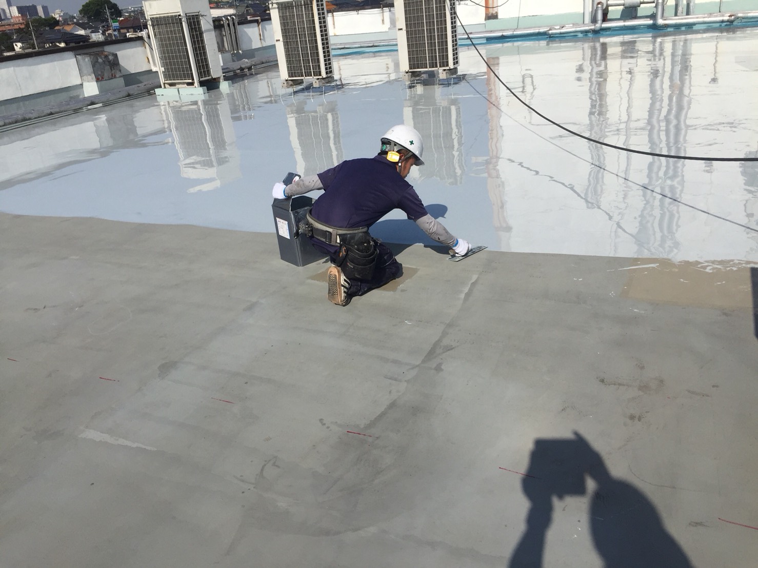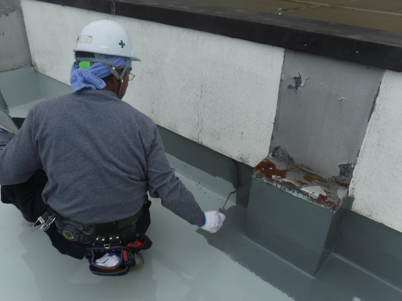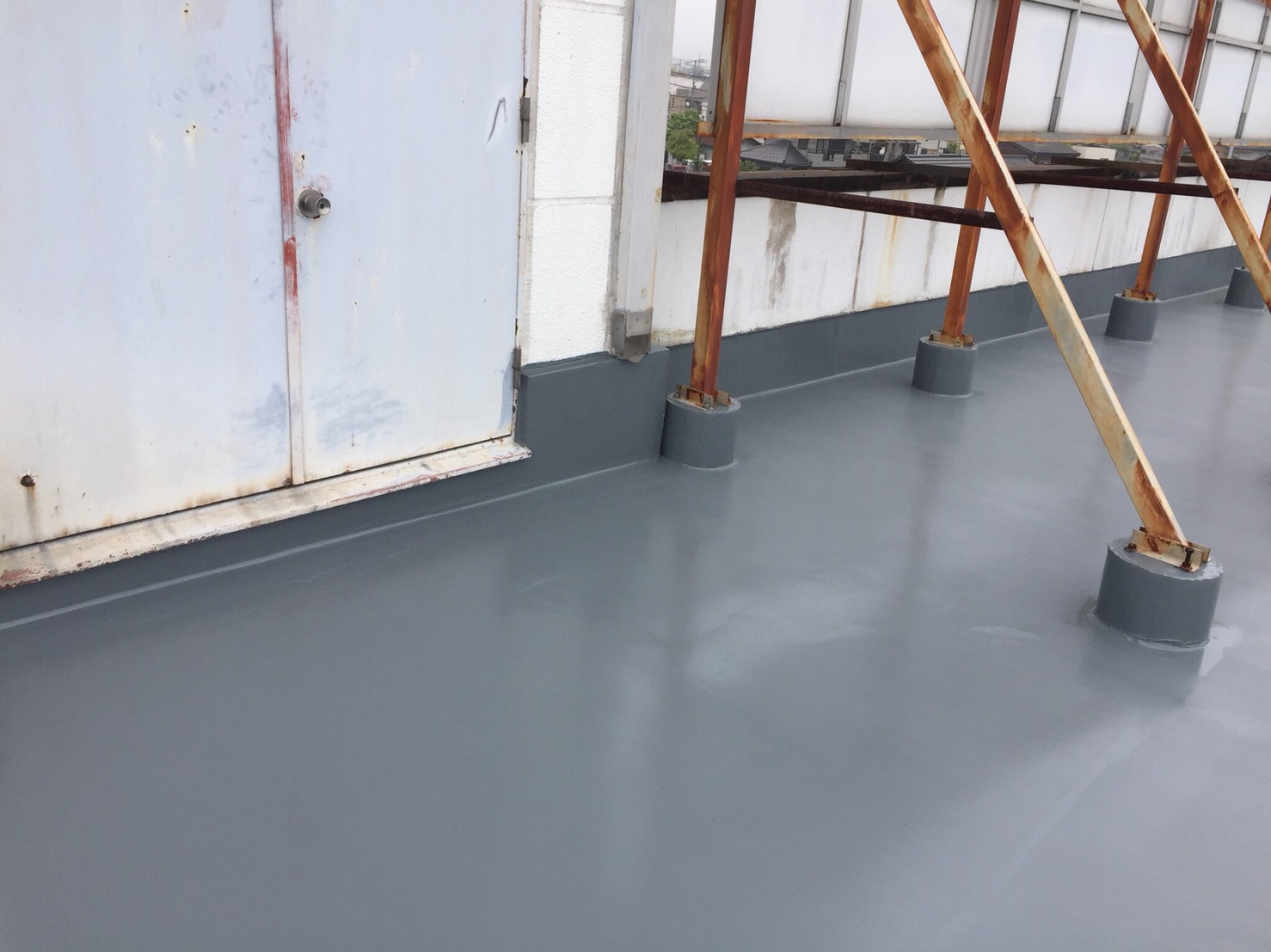 | 施工内容 | 本現場では、約1,000㎡の屋上ウレタン防水工事を実施しました。 既存防水層は劣化が進み、ひび割れや汚れが目立つ状態で、防水機能の低下と将来的な漏水リスクが懸念されていました。 工事では、下地補修と清掃を行った上で、通気緩衝工法によるウレタン塗膜防水を採用。 内部の湿気を逃がしながら2層にわたって防水材を塗布し、厚みのあるシームレスな防水層を形成。 仕上げにはトップコートを施工し、紫外線や風雨から防水層を保護しました。 施工後は、屋上全体が滑らかで均一な仕上がりとなり、美観と機能性が大きく向上しました。 特に立ち上がりや取り合い部分も丁寧に処理され、漏水リスクを大幅に軽減。 大規模な面積での工事でしたが、工程ごとの管理を徹底し、無事故・無災害で完了しています。 |