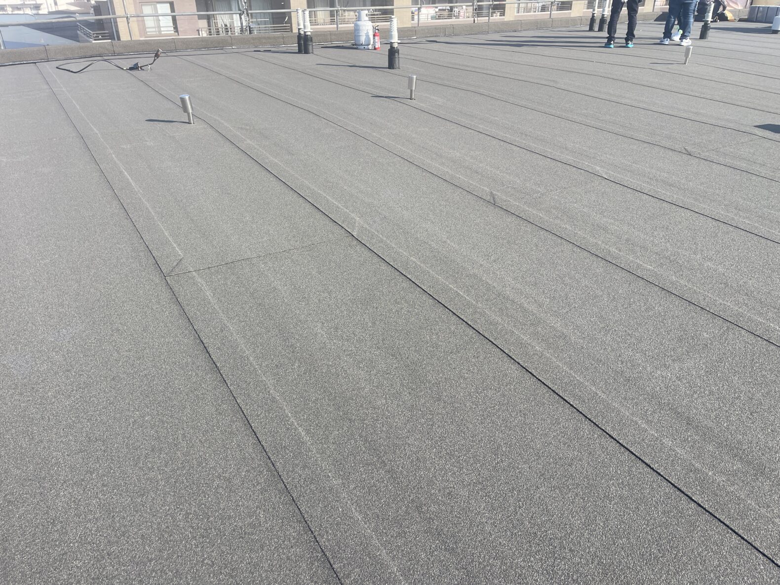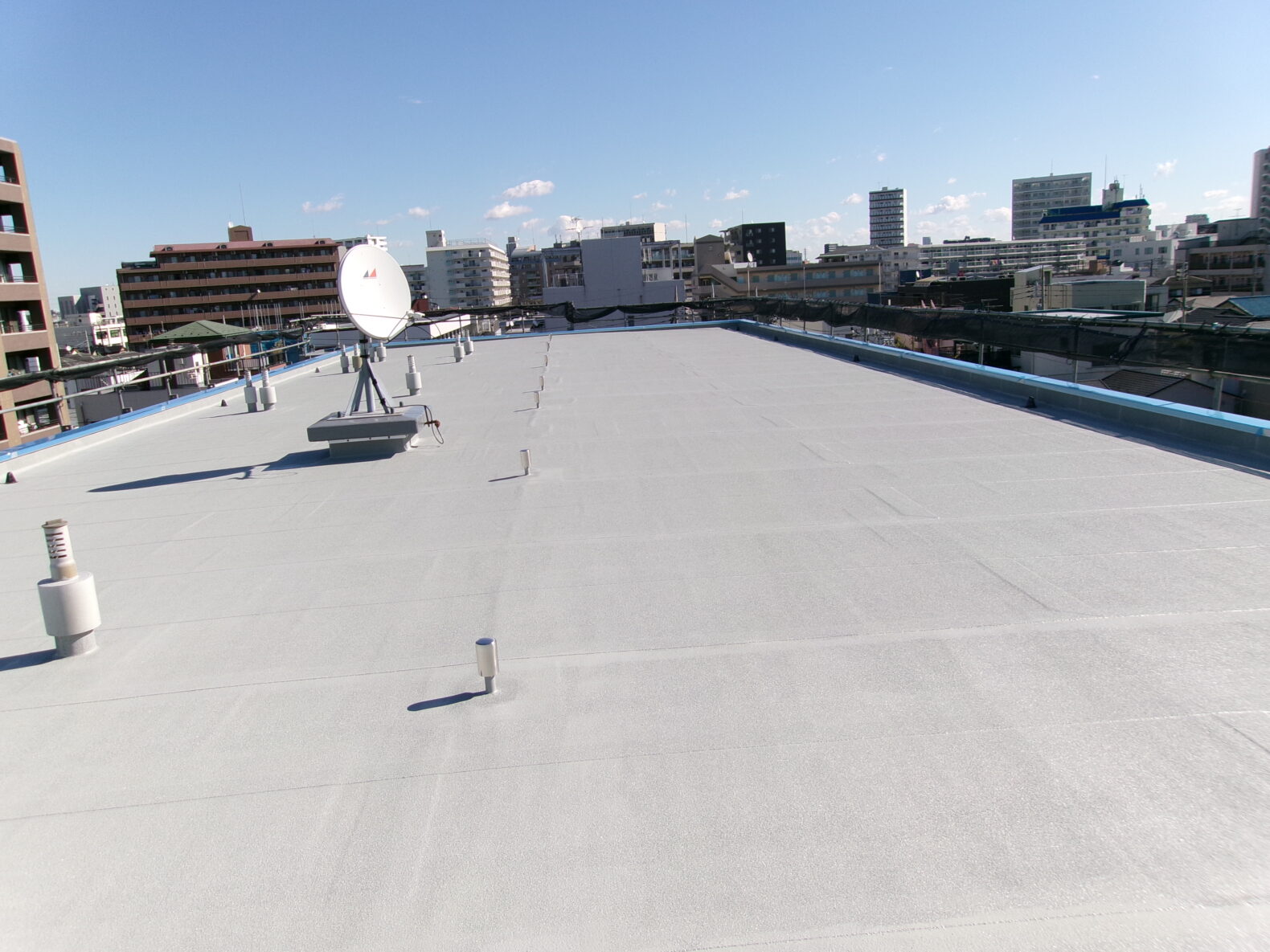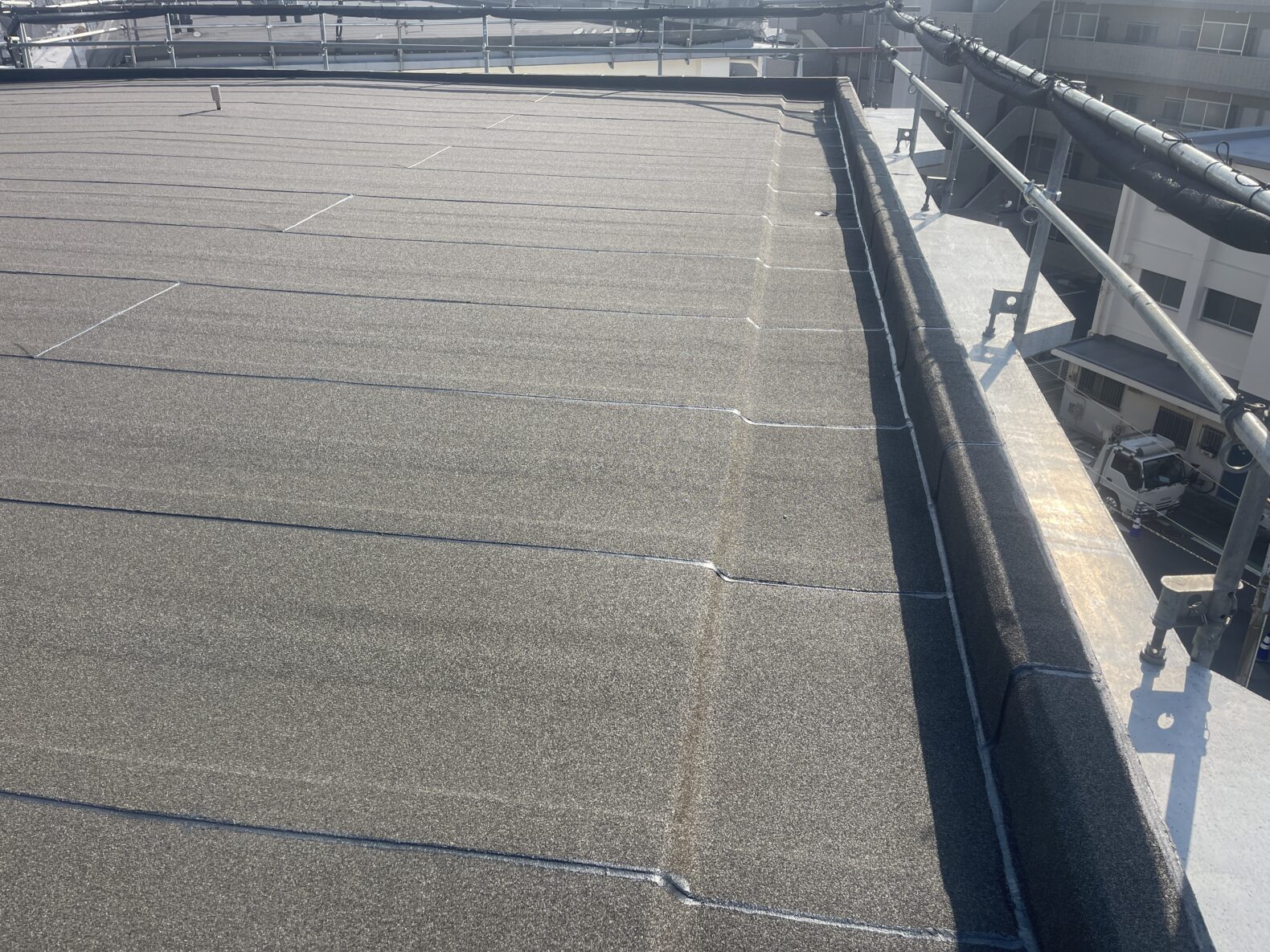 既存のシンダーコンクリート下地を活かしながら、アスファルトシート2層張り+ウレタン塗膜防水により、強固な防水層を形成しています。