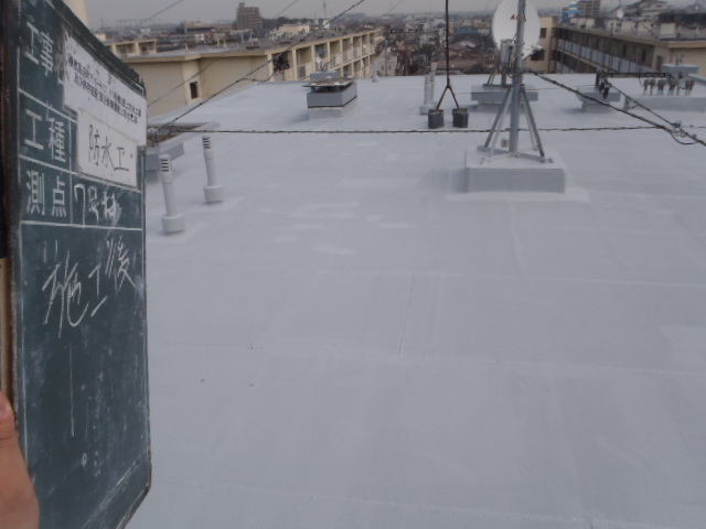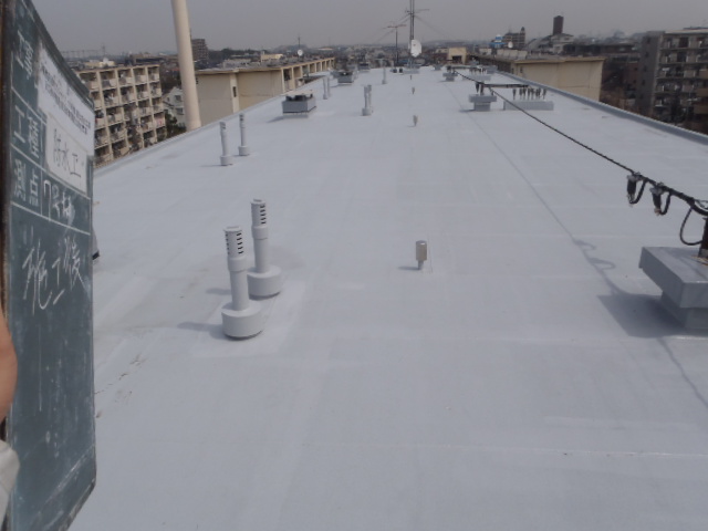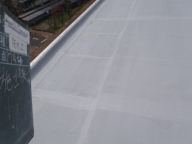 | 施工内容 | 東京都足立区の建物屋上にて、約1,200㎡のアスファルト防水改修を行いました。 現場は規模が大きく、通行量の多い地域ということもあり、安全対策と作業効率の両立が求められる現場でした。 今回は、耐久性と信頼性に優れた「トーチ工法」を採用。シート裏面をバーナーで炙って貼り付けるこの方法は、しっかりと下地と一体化し、水の侵入を長期にわたり防ぐことができるのが大きな特徴です。 また、周囲への火気管理や臭気対策も徹底し、近隣に配慮した作業を進めました。 作業範囲が広いため、複数の班で工程を分担し、資材の搬入・運搬計画も事前に綿密に調整。 動線の確保や資材管理にも工夫を凝らし、現場全体がスムーズに回るよう運営しました。 施工完了後は、広い屋上全面が均一な防水層に覆われ、視覚的にも整った印象に。 防水性能の向上はもちろん、建物の寿命を延ばすうえでも、重要な改修となりました。 |